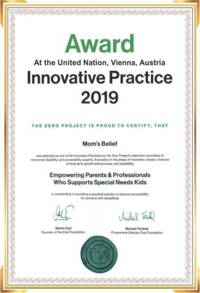 Mom’s Belief was recognized at UNITED NATIONS, Vienna, for its innovative model that supports the parents of special needs children and the professionals who work with them. Awarded by the Austria-based Zero Project as an innovation that helps eliminate the barriers faced by the disabled.
